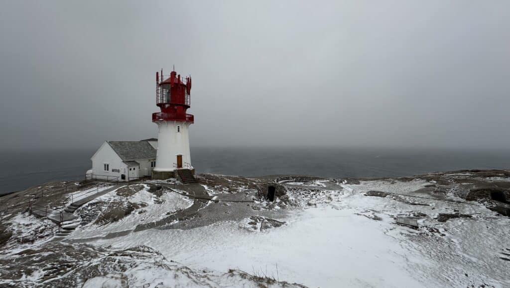 Etter en dag med mye sol og fint vær i går, så har det nå skyet til på himmelen. Det har ikke kommet så mye nedbør enda, men i dag kan jeg love dere at det kommer til å snø jevnt utover hele dagen. Det er fortsatt kaldt og en del vind med kuling i kastene. Dette resulterer i at snøen fonner seg, i hvert fall her ytterst på neset. Det er ikke lett å måle snødybden når det blåser så mye, men prognosene sier at det kan komme 10-15 cm med snø i dag og til sammen opp mot 20 cm innen utgangen av mandagen nå etter helgen. Ellers kan jeg melde om svak sjø med rett over en meter høye bølger.